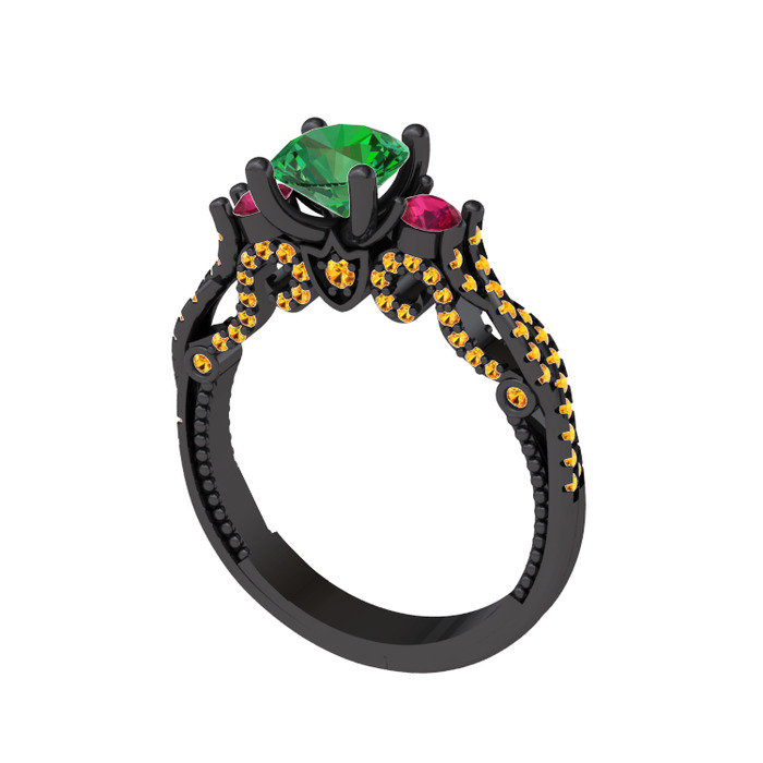 Yeşil kuvars, rodolit garnet ve sitrin 925 ayar siyah rodyum kaplama gümüş yüzük