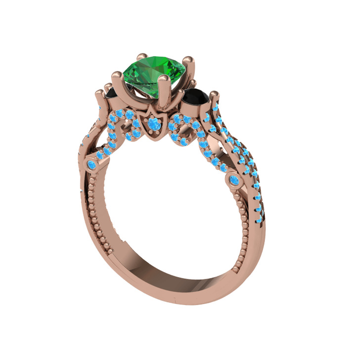 Yeşil kuvars, siyah zirkon ve akuamarin 925 ayar rose altın kaplama gümüş yüzük