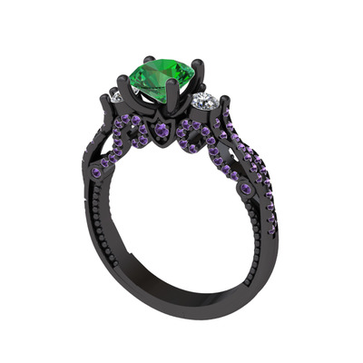 Yeşil kuvars, swarovski ve ametist 925 ayar siyah rodyum kaplama gümüş yüzük