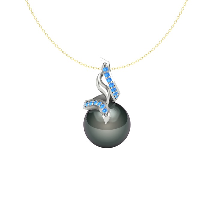 Siyah inci ve akuamarin 14 ayar beyaz altın kolye (40 cm gümüş rolo zincir)