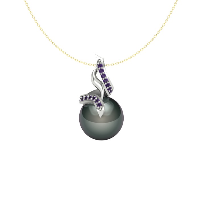 Siyah inci ve ametist 14 ayar beyaz altın kolye (40 cm altın rolo zincir)