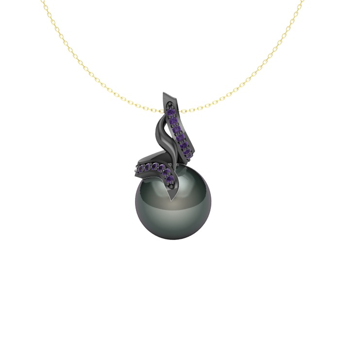 Siyah inci ve ametist 925 ayar siyah rodyum kaplama gümüş kolye (40 cm altın rolo zincir)