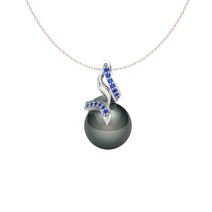 Siyah inci ve lab safir 18 ayar beyaz altın kolye (40 cm rose altın rolo zincir)