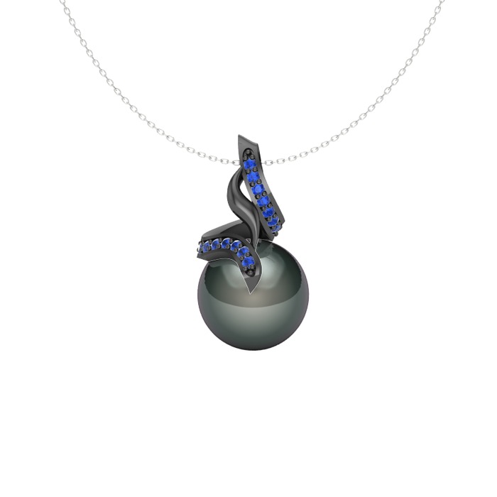 Siyah inci ve lab safir 925 ayar siyah rodyum kaplama gümüş kolye (40 cm beyaz altın rolo zincir)