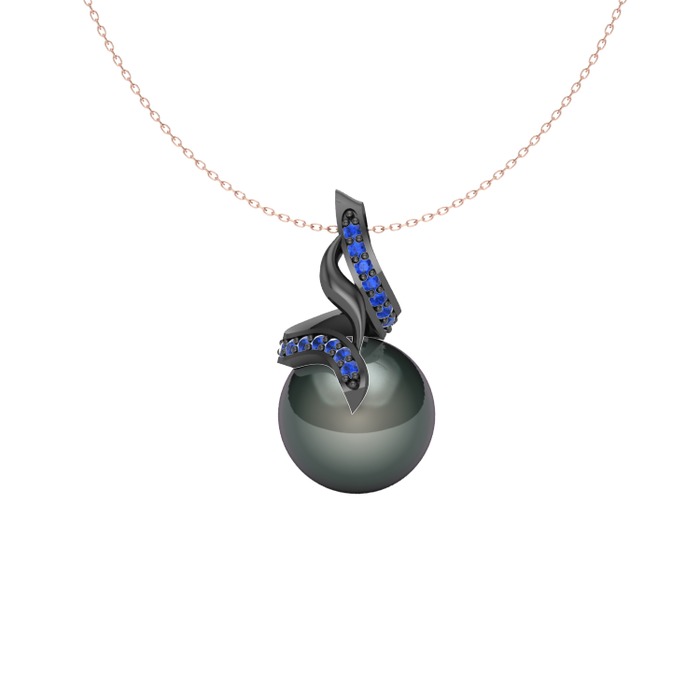 Siyah inci ve lab safir 925 ayar siyah rodyum kaplama gümüş kolye (40 cm gümüş rolo zincir)