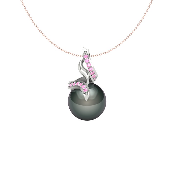 Siyah inci ve pembe kuvars 8 ayar beyaz altın kolye (40 cm rose altın rolo zincir)