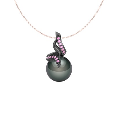 Siyah inci ve pembe kuvars 925 ayar siyah rodyum kaplama gümüş kolye (40 cm gümüş rolo zincir)