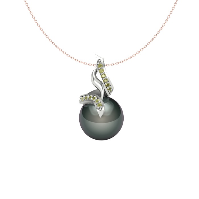 Siyah inci ve peridot 14 ayar beyaz altın kolye (40 cm rose altın rolo zincir)