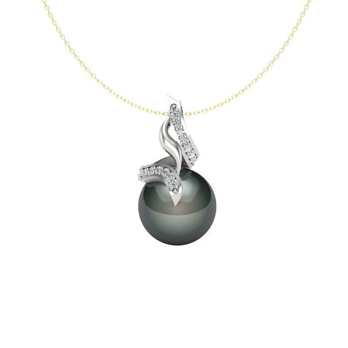 Siyah inci ve pırlanta 14 ayar beyaz altın kolye (0.2288 karat, 40 cm altın rolo zincir)