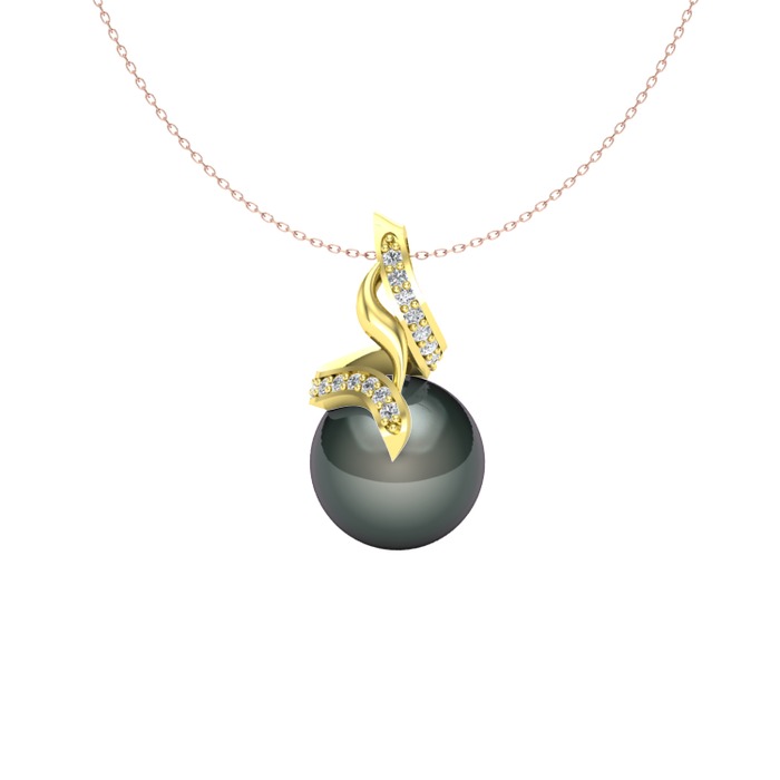 Siyah inci ve pırlanta 925 ayar altın kaplama gümüş kolye (0.2288 karat, 40 cm gümüş rolo zincir)