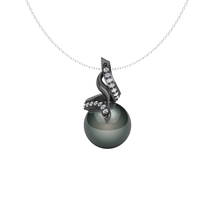 Siyah inci ve pırlanta 925 ayar siyah rodyum kaplama gümüş kolye (0.2288 karat, 40 cm beyaz altın rolo zincir)