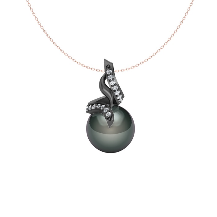 Siyah inci ve pırlanta 925 ayar siyah rodyum kaplama gümüş kolye (0.2288 karat, 40 cm rose altın rolo zincir)