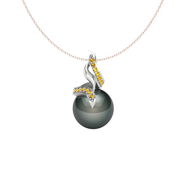 Siyah inci ve sitrin 8 ayar beyaz altın kolye (40 cm rose altın rolo zincir)