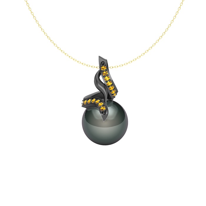 Siyah inci ve sitrin 925 ayar siyah rodyum kaplama gümüş kolye (40 cm altın rolo zincir)