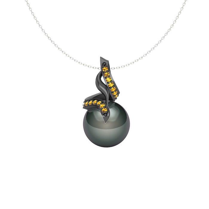 Siyah inci ve sitrin 925 ayar siyah rodyum kaplama gümüş kolye (40 cm beyaz altın rolo zincir)