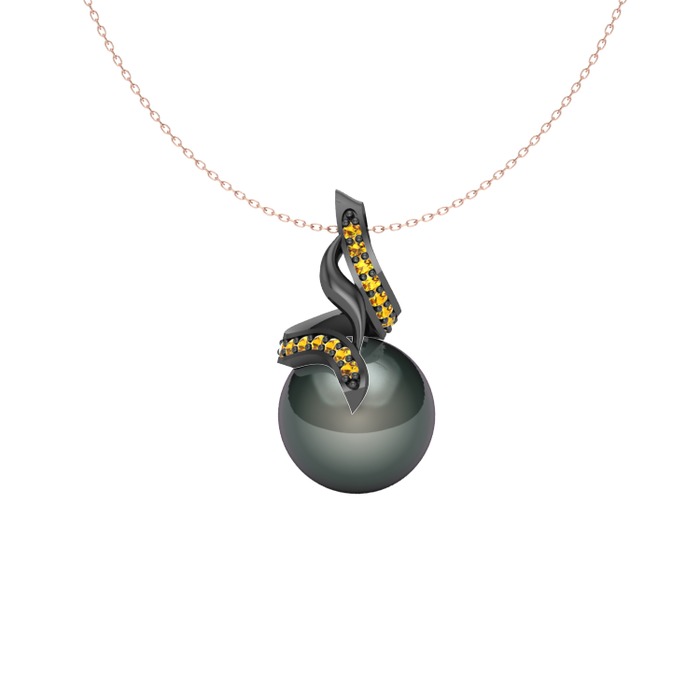 Siyah inci ve sitrin 925 ayar siyah rodyum kaplama gümüş kolye (40 cm rose altın rolo zincir)