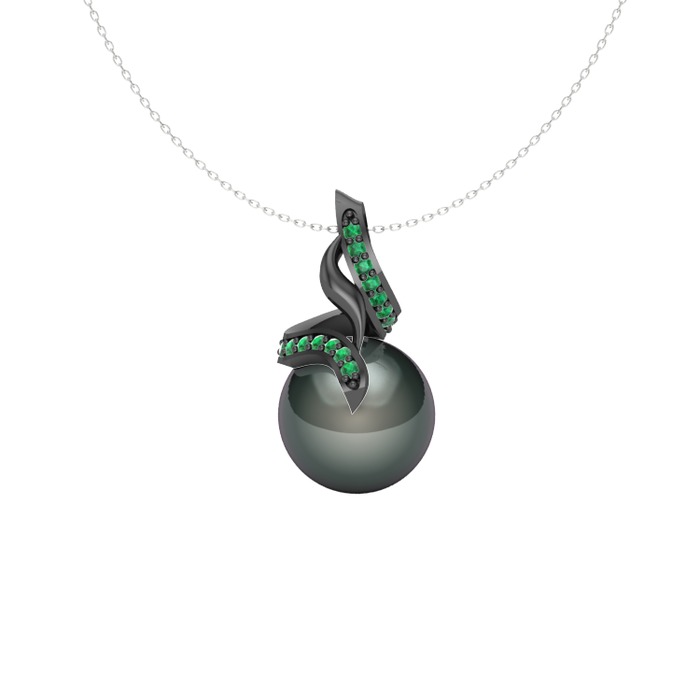 Siyah inci ve yeşil kuvars 925 ayar siyah rodyum kaplama gümüş kolye (40 cm beyaz altın rolo zincir)