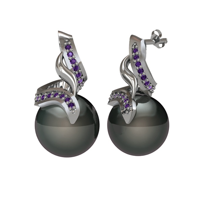 Siyah inci ve ametist 14 ayar beyaz altın küpe