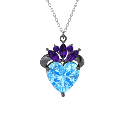 Akuamarin ve ametist 925 ayar siyah rodyum kaplama gümüş kolye (40 cm beyaz altın rolo zincir)