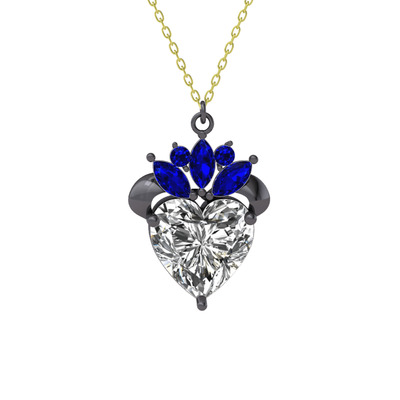 Beyaz zirkon ve lab safir 925 ayar siyah rodyum kaplama gümüş kolye (40 cm altın rolo zincir)