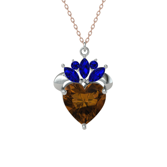 Dumanlı kuvars ve lab safir 18 ayar beyaz altın kolye (40 cm rose altın rolo zincir)