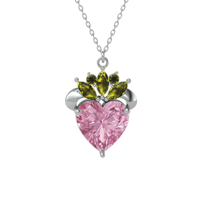 Pembe kuvars ve peridot 14 ayar beyaz altın kolye (40 cm gümüş rolo zincir)