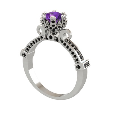 Ametist ve siyah zirkon 14 ayar beyaz altın yüzük