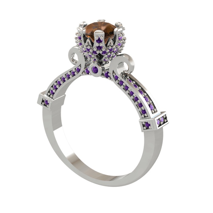 Dumanlı kuvars ve ametist 8 ayar beyaz altın yüzük