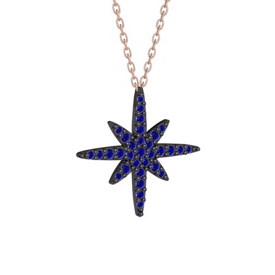 Lab safir 925 ayar siyah rodyum kaplama gümüş kolye (40 cm rose altın rolo zincir)