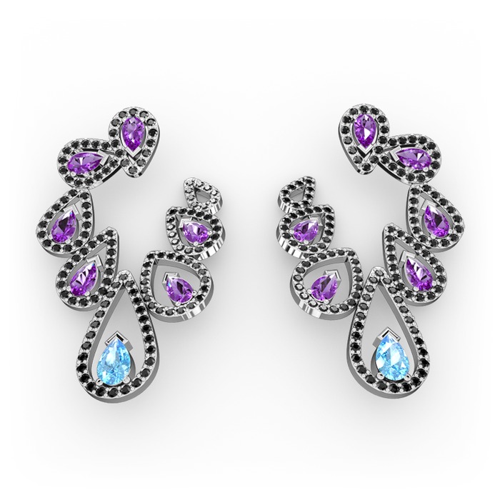 Akuamarin, ametist ve siyah zirkon 8 ayar beyaz altın küpe