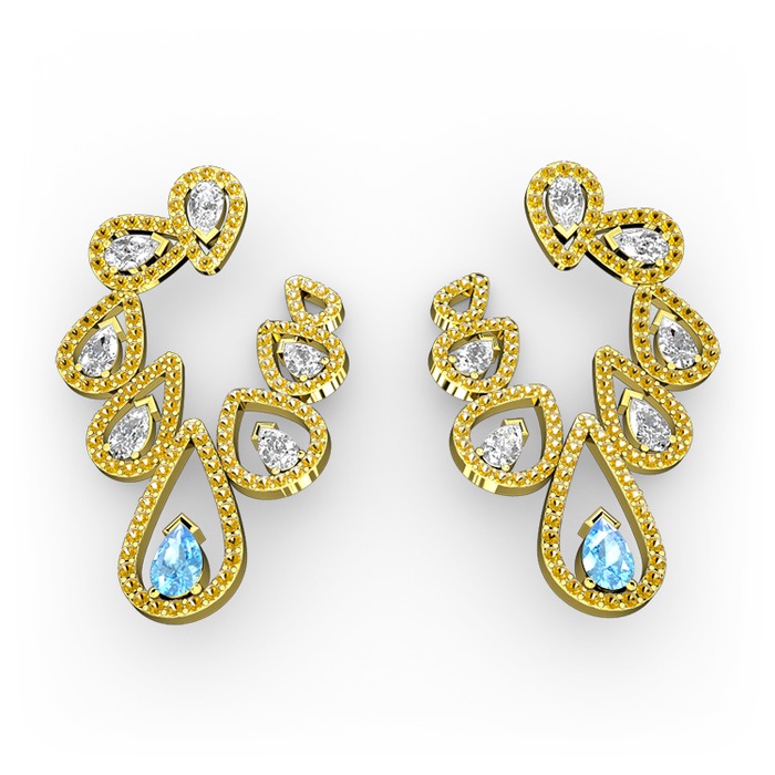 Akuamarin, beyaz zirkon ve sitrin 14 ayar altın küpe