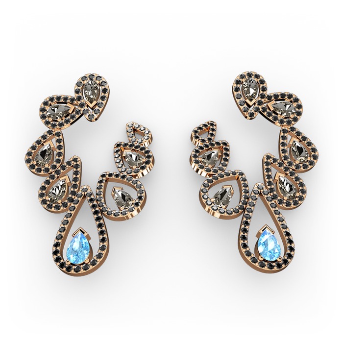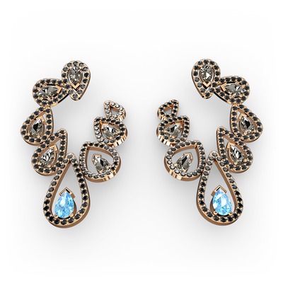 Akuamarin, dumanlı kuvars ve siyah zirkon 18 ayar rose altın küpe