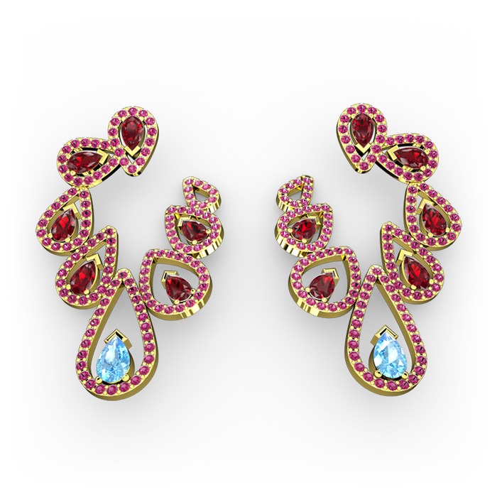 Akuamarin, garnet ve rodolit garnet 14 ayar altın küpe