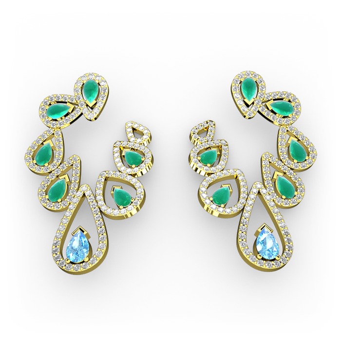 Akuamarin, kök zümrüt ve pırlanta 8 ayar altın küpe (2.882 karat)