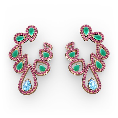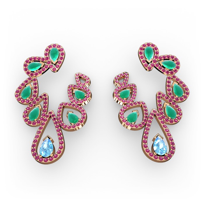 Akuamarin, kök zümrüt ve rodolit garnet 14 ayar rose altın küpe