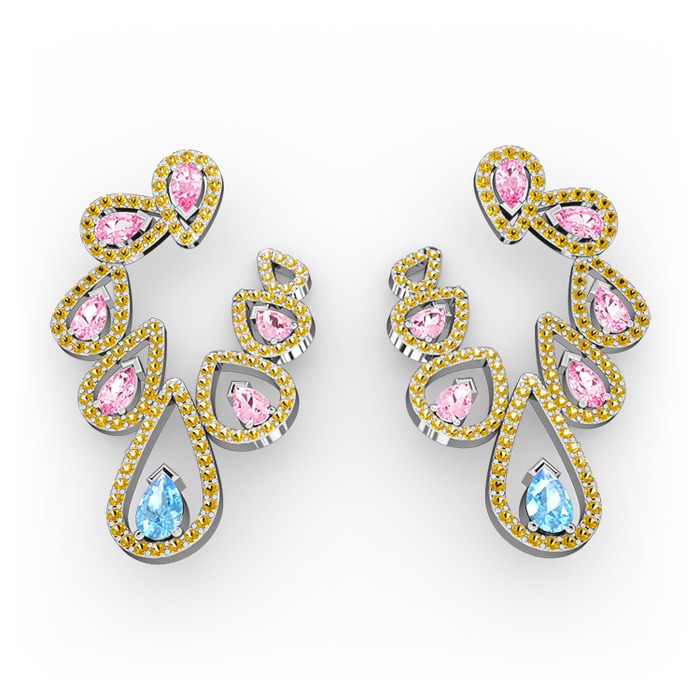 Akuamarin, pembe kuvars ve sitrin 8 ayar beyaz altın küpe