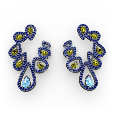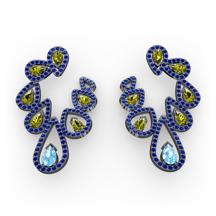 Akuamarin, peridot ve lab safir 925 ayar siyah rodyum kaplama gümüş küpe