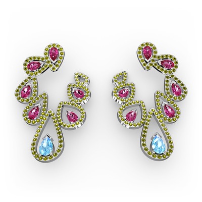 Akuamarin, rodolit garnet ve peridot 18 ayar beyaz altın küpe