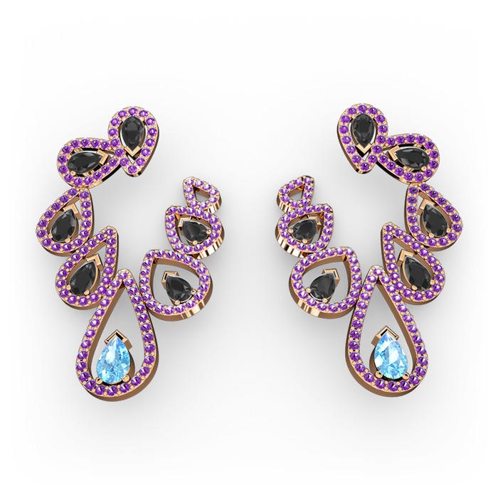 Akuamarin, siyah zirkon ve ametist 14 ayar rose altın küpe