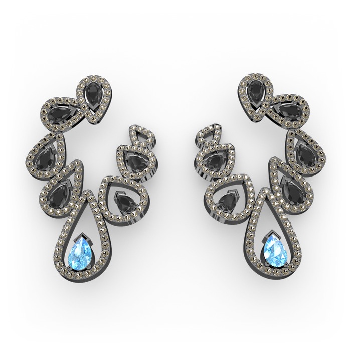 Akuamarin, siyah zirkon ve dumanlı kuvars 925 ayar siyah rodyum kaplama gümüş küpe