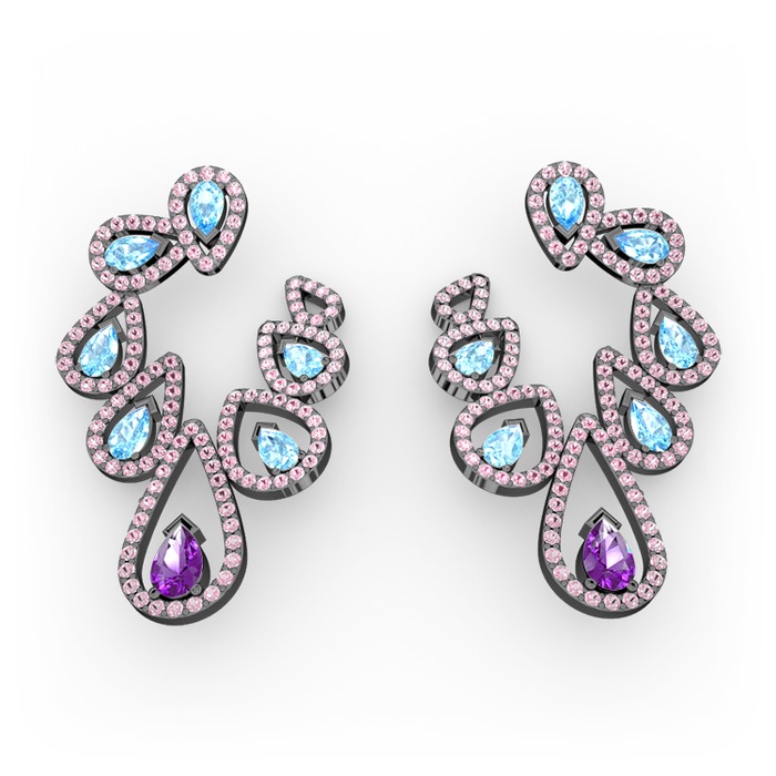 Ametist, akuamarin ve pembe kuvars 925 ayar siyah rodyum kaplama gümüş küpe