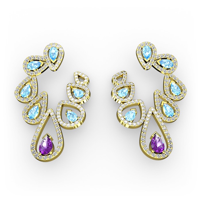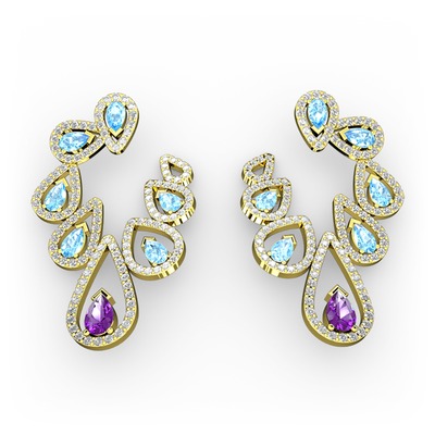 Ametist, akuamarin ve pırlanta 925 ayar altın kaplama gümüş küpe (2.882 karat)