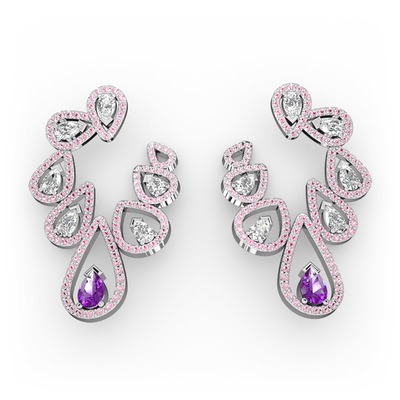 Ametist, beyaz zirkon ve pembe kuvars 8 ayar beyaz altın küpe