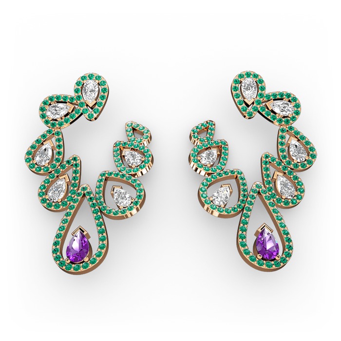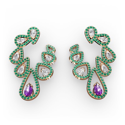 Ametist, beyaz zirkon ve yeşil kuvars 18 ayar rose altın küpe