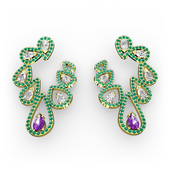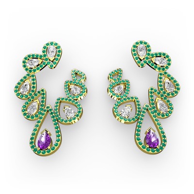 Ametist, beyaz zirkon ve yeşil kuvars 8 ayar altın küpe
