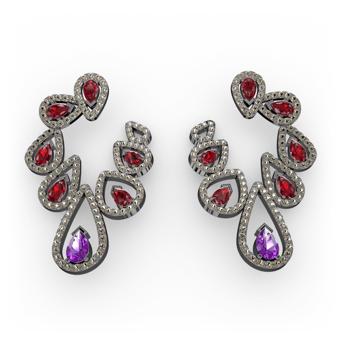 Ametist, garnet ve dumanlı kuvars 925 ayar siyah rodyum kaplama gümüş küpe