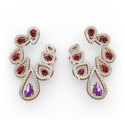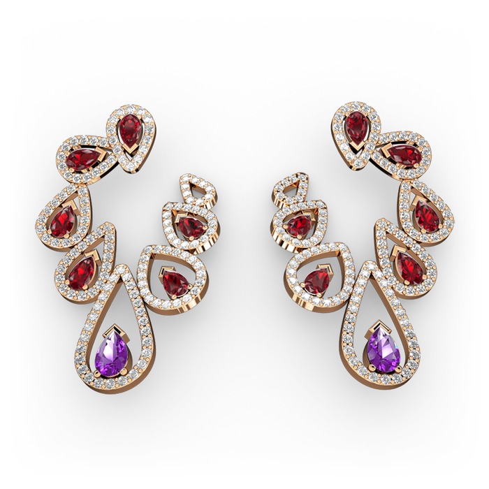 Ametist, garnet ve swarovski 18 ayar rose altın küpe