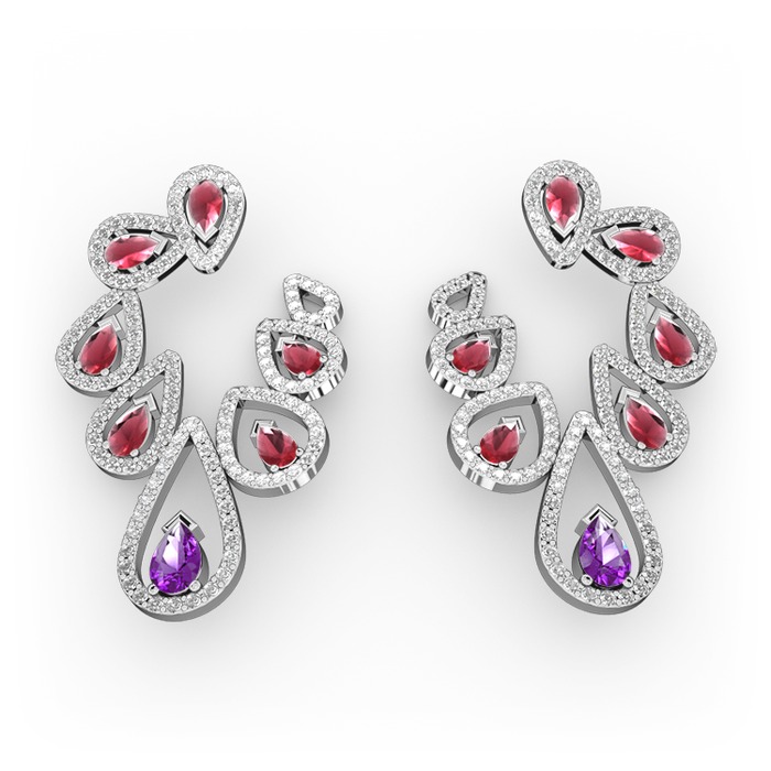 Ametist, kök yakut ve pırlanta 14 ayar beyaz altın küpe (2.882 karat)