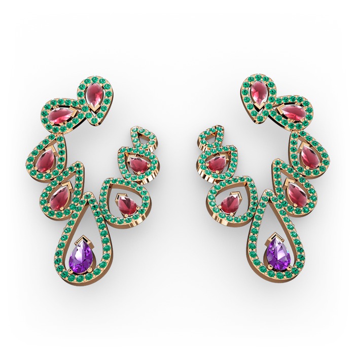 Ametist, kök yakut ve yeşil kuvars 18 ayar rose altın küpe