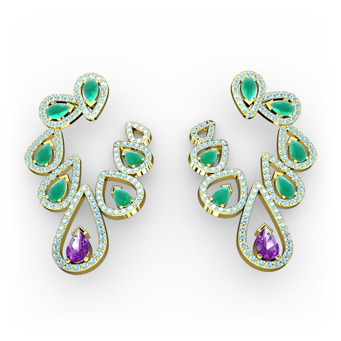 Ametist, kök zümrüt ve akuamarin 14 ayar altın küpe